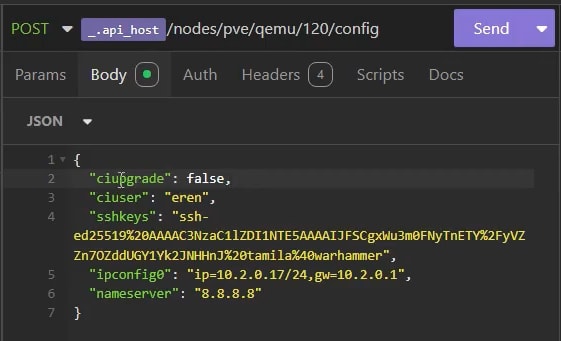 /nodes/node/qemu/vmid/configendpoint with the above details - Make sure to url-encode the ssh-public-key before passing it in the request.