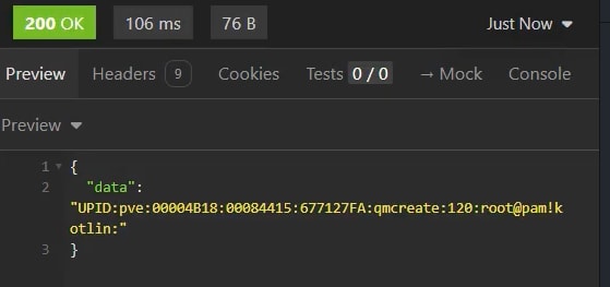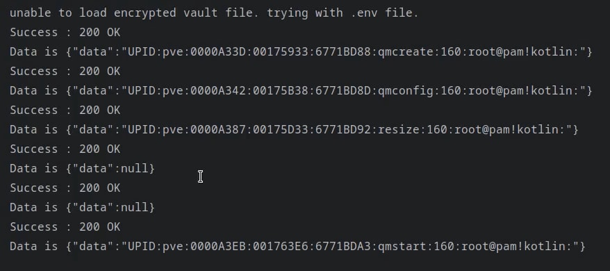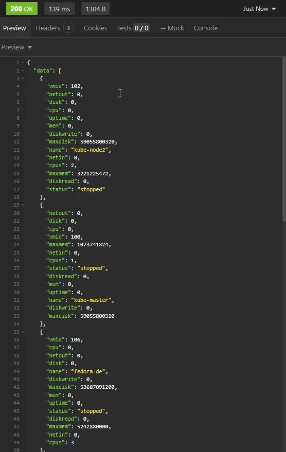 Ctrl + Enter, and we should get the details of all the VMs that are created in the particular proxmox node - With this, we have got a working API client setup. Next we can proceed towards creating a VM