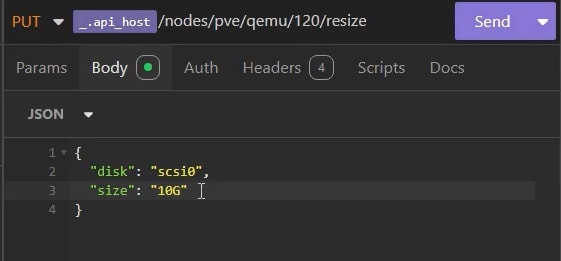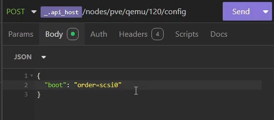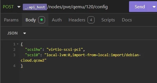 /nodes/node/qemu/vmid/configendpointThe json body contains type of disk we need specified in scsihw and details of the first disk specified in scsi0