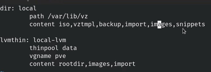 /etc/pve/storage.cfgusing text editor of your choicevim /etc/pve/storage.cfg - Add the words images and import in both the sections i.e local and local-lvm