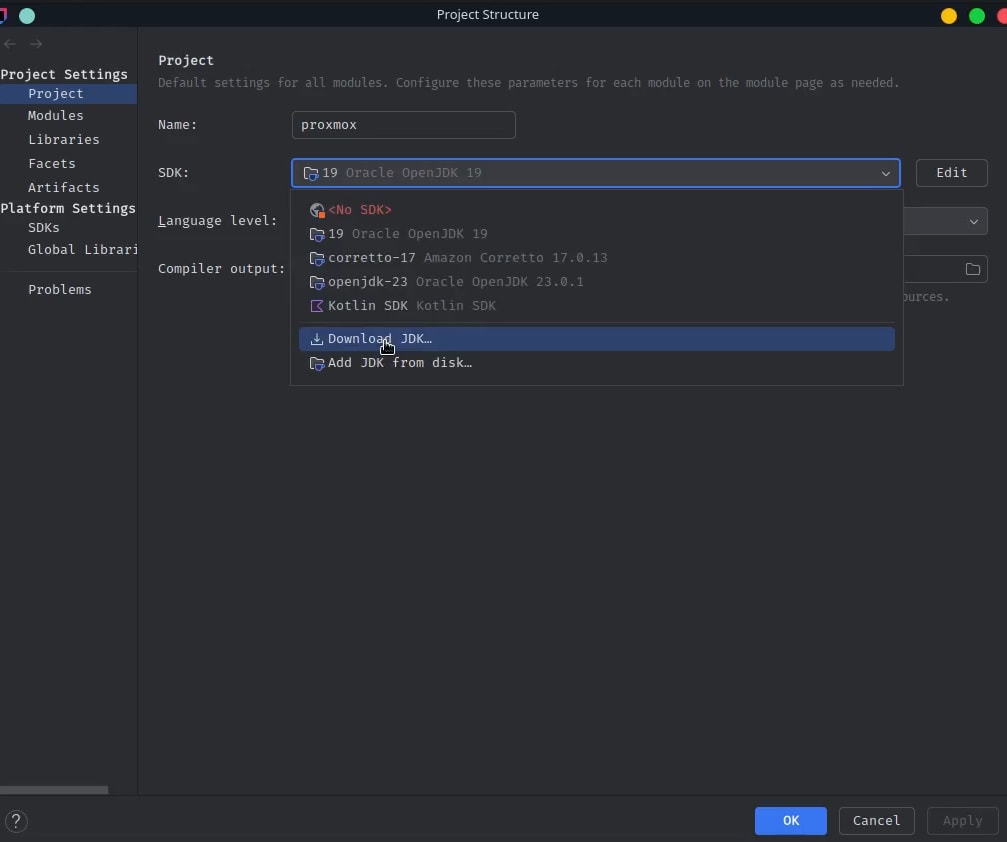 File,Project Structureand choose SDK as Oracle OpenJDK 19. If you need other versions, choose below 19 as higher than this version gives errors. - If it does not show any JDK, we can download by clicking on Download JDK
