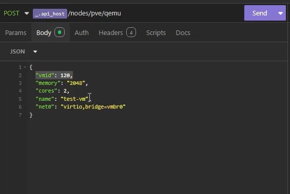 1. Create vm - It uses the POST request on /nodes/node/qemu endpoint to create a vm